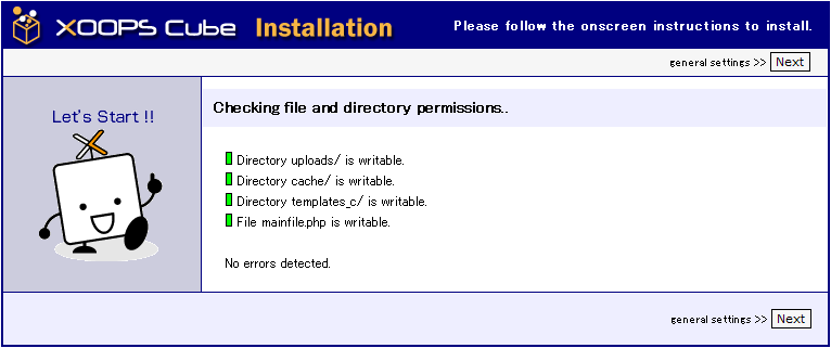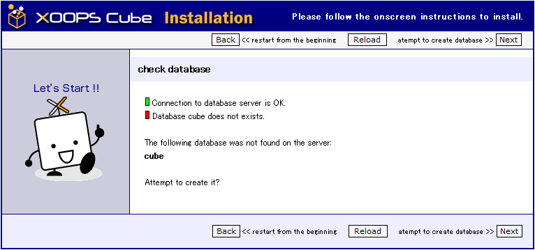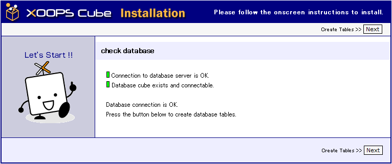 After performing the above procedures, you're ready to continue installing XOOPS Cube Legacy with the Install Wizard. The first screen in the install Wizard takes you to will be the welcome screen.